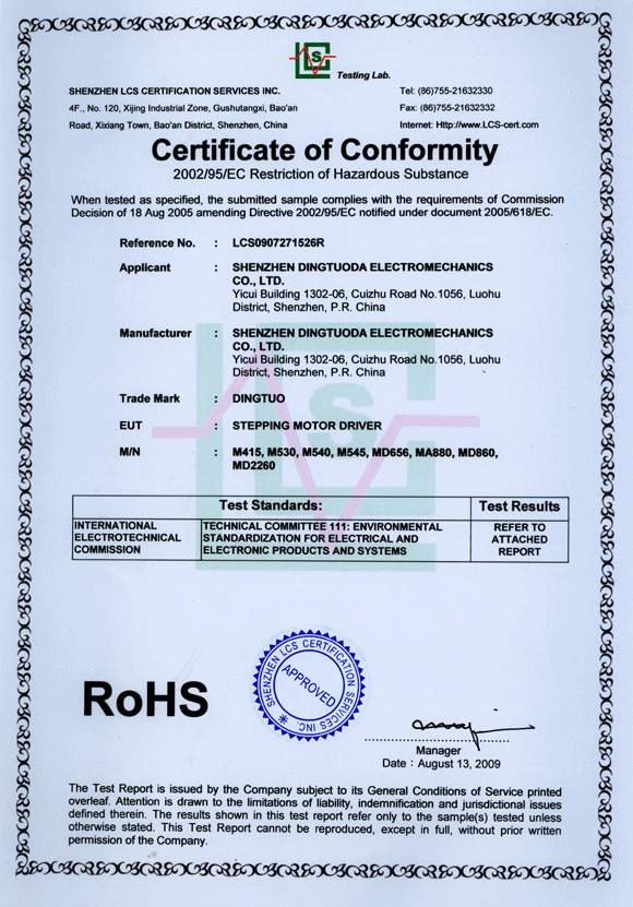 首頁->產(chǎn)品認證->步進驅(qū)動器RoHS認證證書